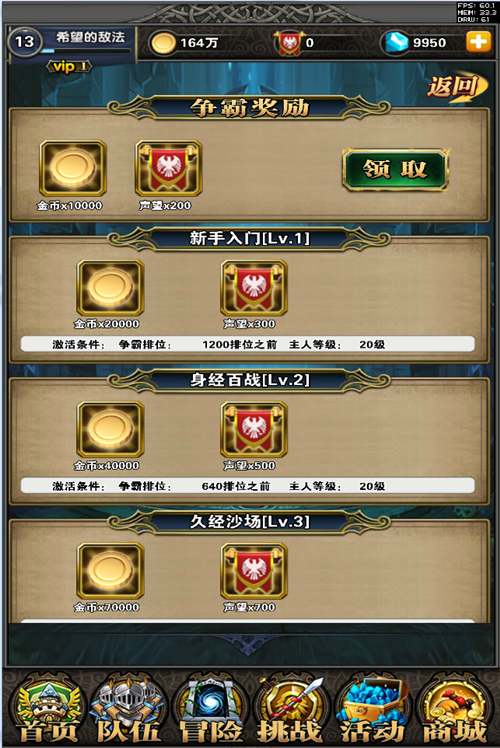 争霸排名奖励:玩家达到级后开放该玩法,排名越靠前,次日可领取的争霸奖励奖励越多,争霸奖励需要同时满足高排名和高等级哦;首次击败:首次击败后,可在邮件中领取通关奖励,大量钻石、声望、金币奖励等您拿哦!