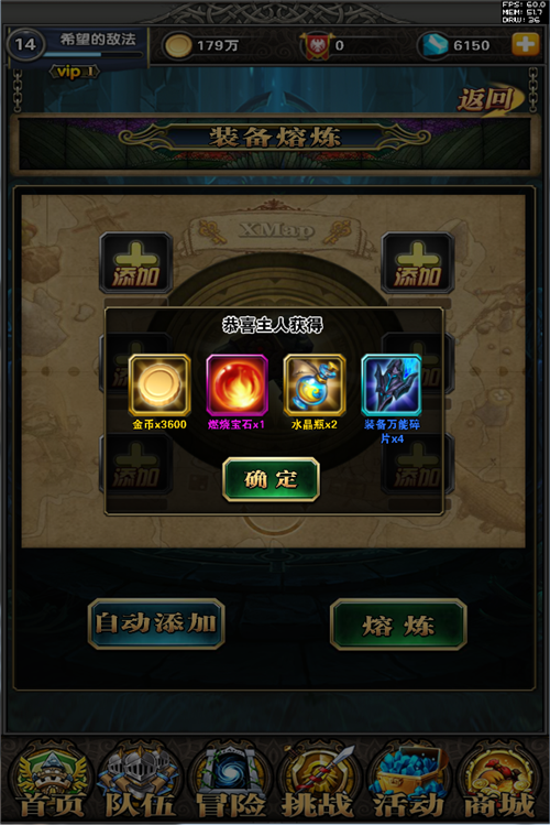 《挂机联盟》中装备主要获得途径:冒险战斗获得、神秘商店购买、装备熔炼